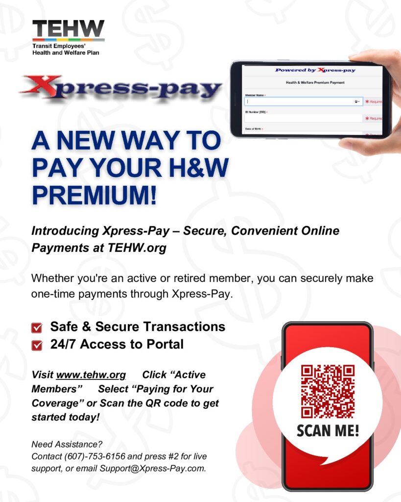 Great news! XpressPay is now available for members to securely pay their premium payments online! Whether you’re an active or retired member, you can now make one-time payments conveniently through our website.