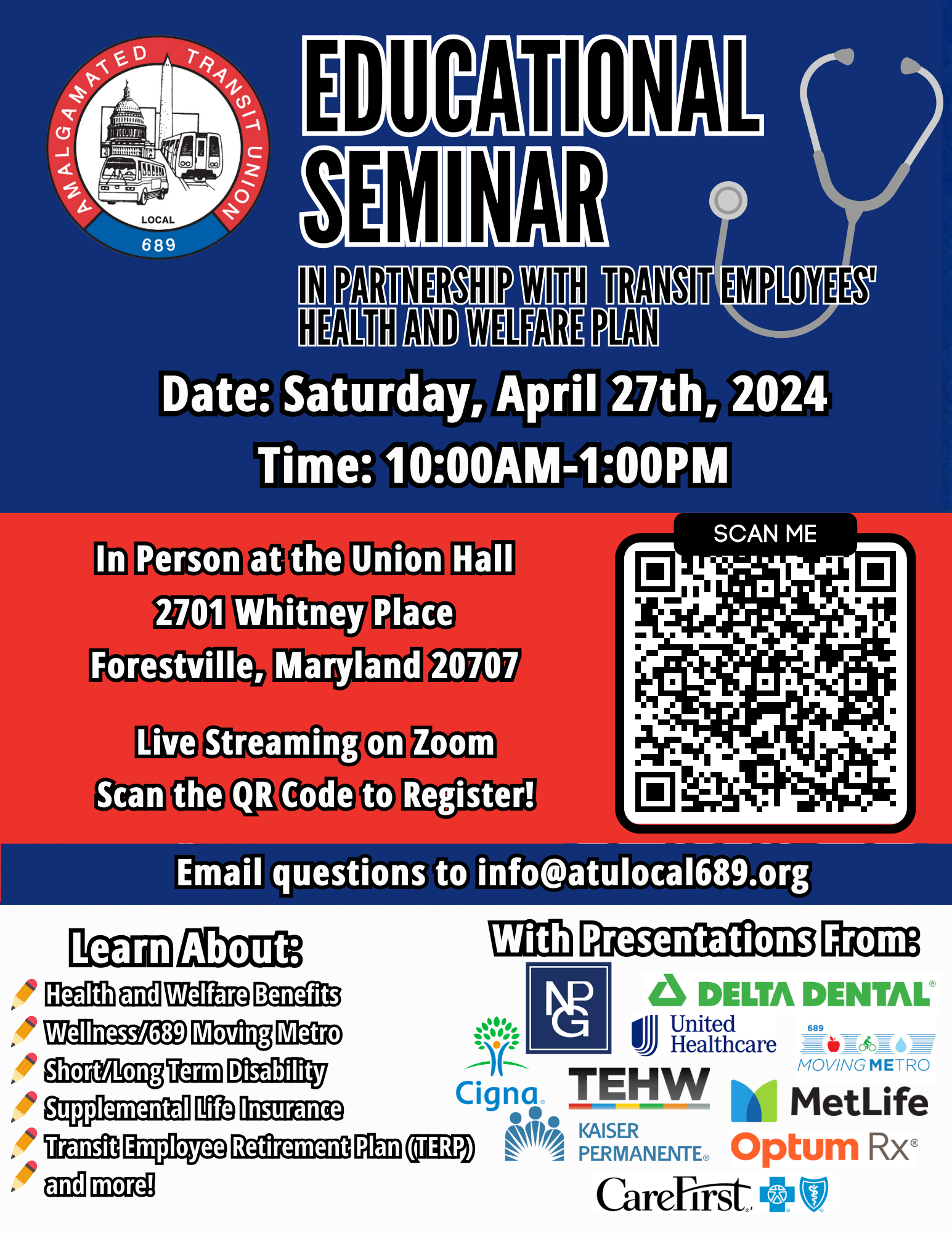Join Transit Employees’ Health and Welfare as we partner with Local 689 for their annual Educational Seminar on April 27th, 2024 from 10AM to 1PM. Learn about Health and Welfare Benefits, Health and Wellness (689 Moving Metro), Short/Long Term Disability, Supplemental Life Insurance, Transit Employee Retirement Plan (TERP) and much more! Medical and Dental carriers …
